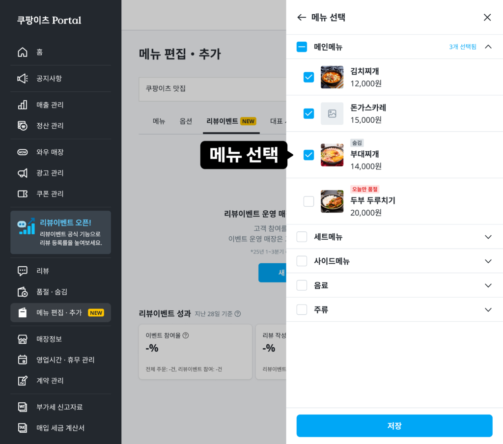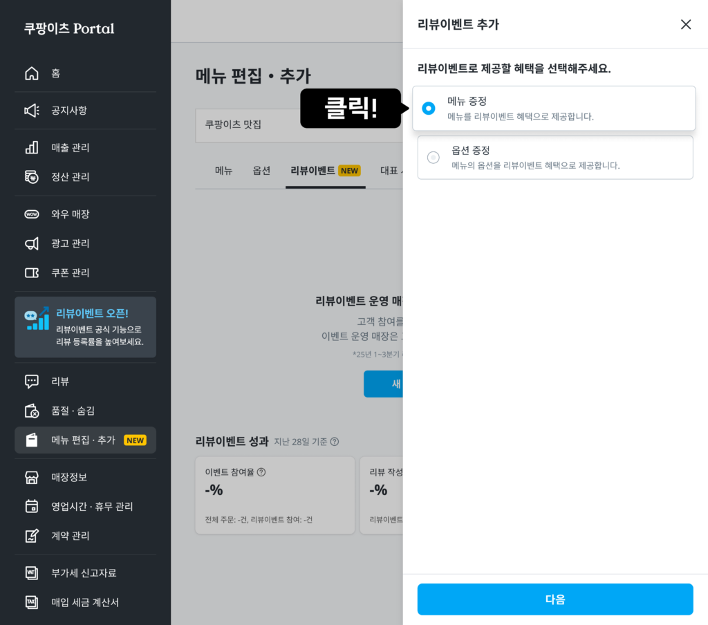 - 추가) ‘리뷰이벤트 메뉴 추가’ 버튼을 눌러 추가할 메뉴를 계속 등록할 수 있어요.