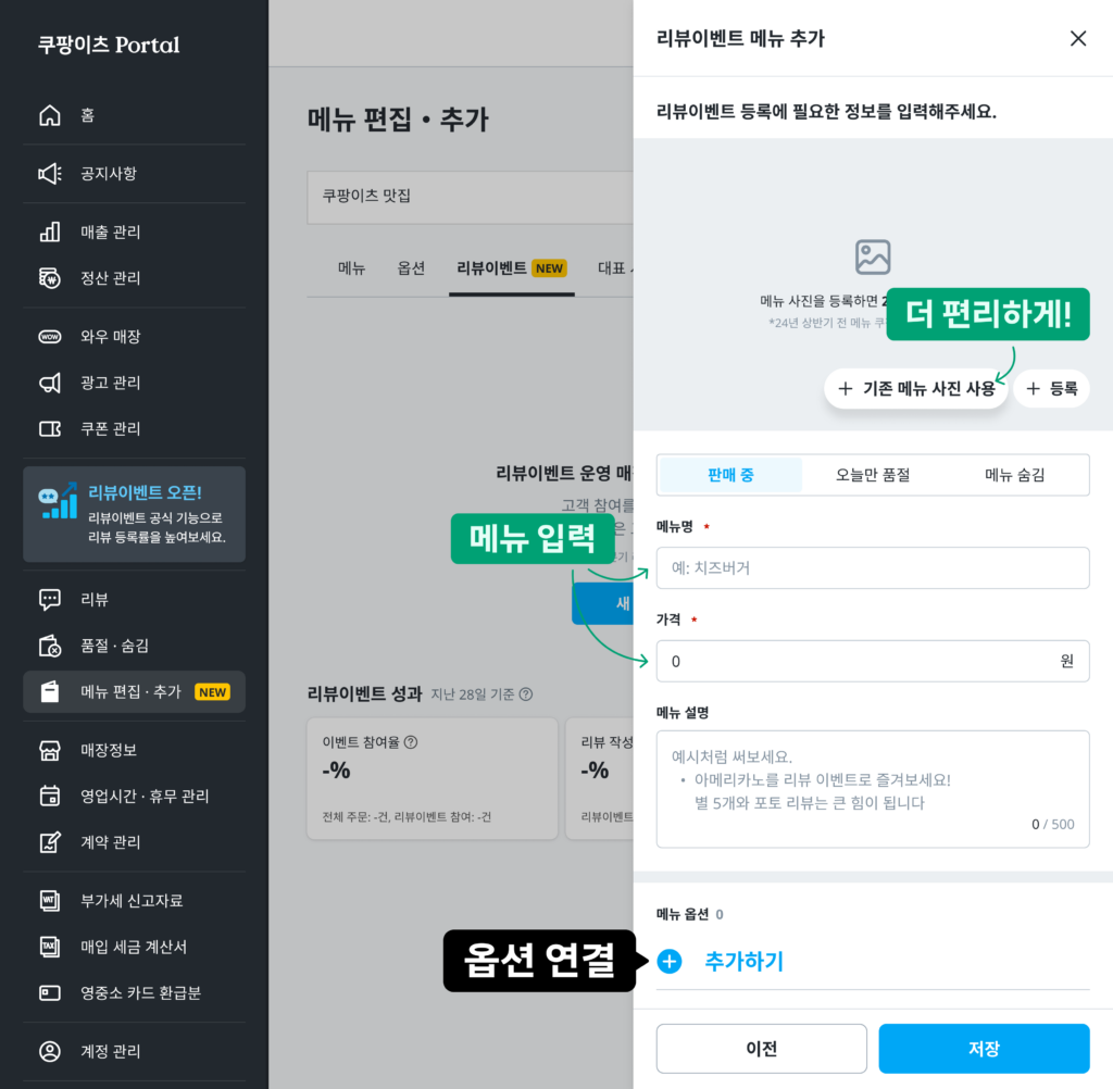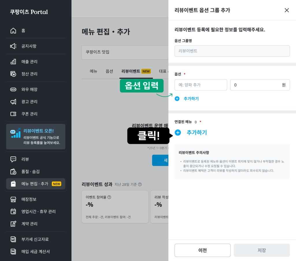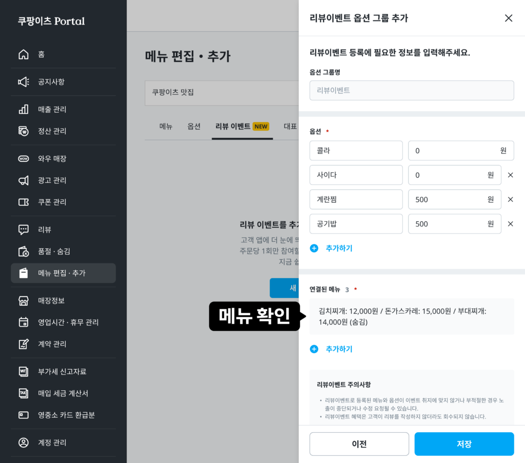 * 리뷰이벤트 메뉴/옵션 항목에는 실제 고객에게 제공되는 혜택만 입력해 주시기 바랍니다. “리뷰참여 안할래요”와 같이 리뷰이벤트 참여 여부를 선택하는 항목은 등록이 불가합니다.
