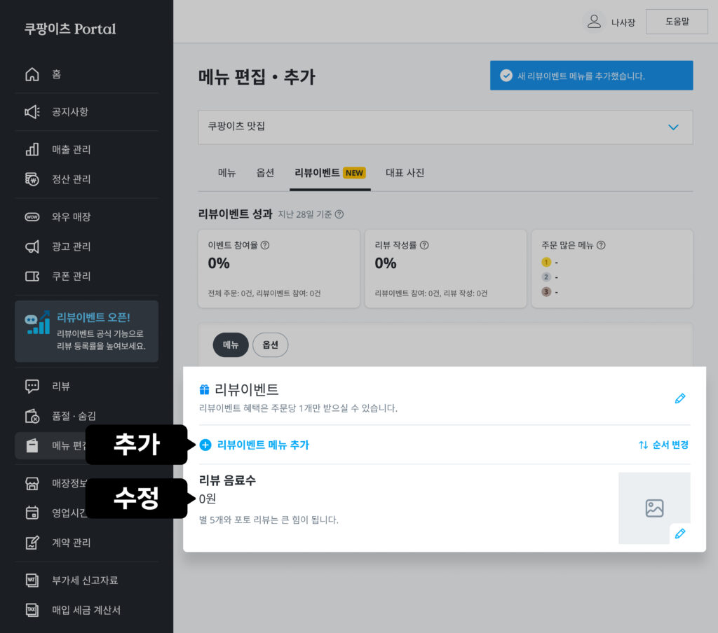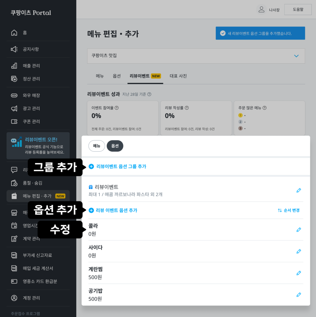Ⓘ 리뷰이벤트 메뉴 그룹이 자동으로 생성됩니다.