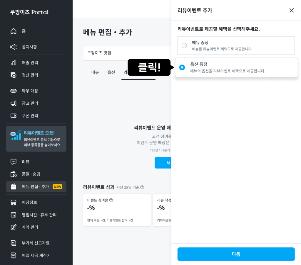 고객이 메뉴를 선택했을 때 옵션으로 리뷰이벤트를 제공하고 싶다면,