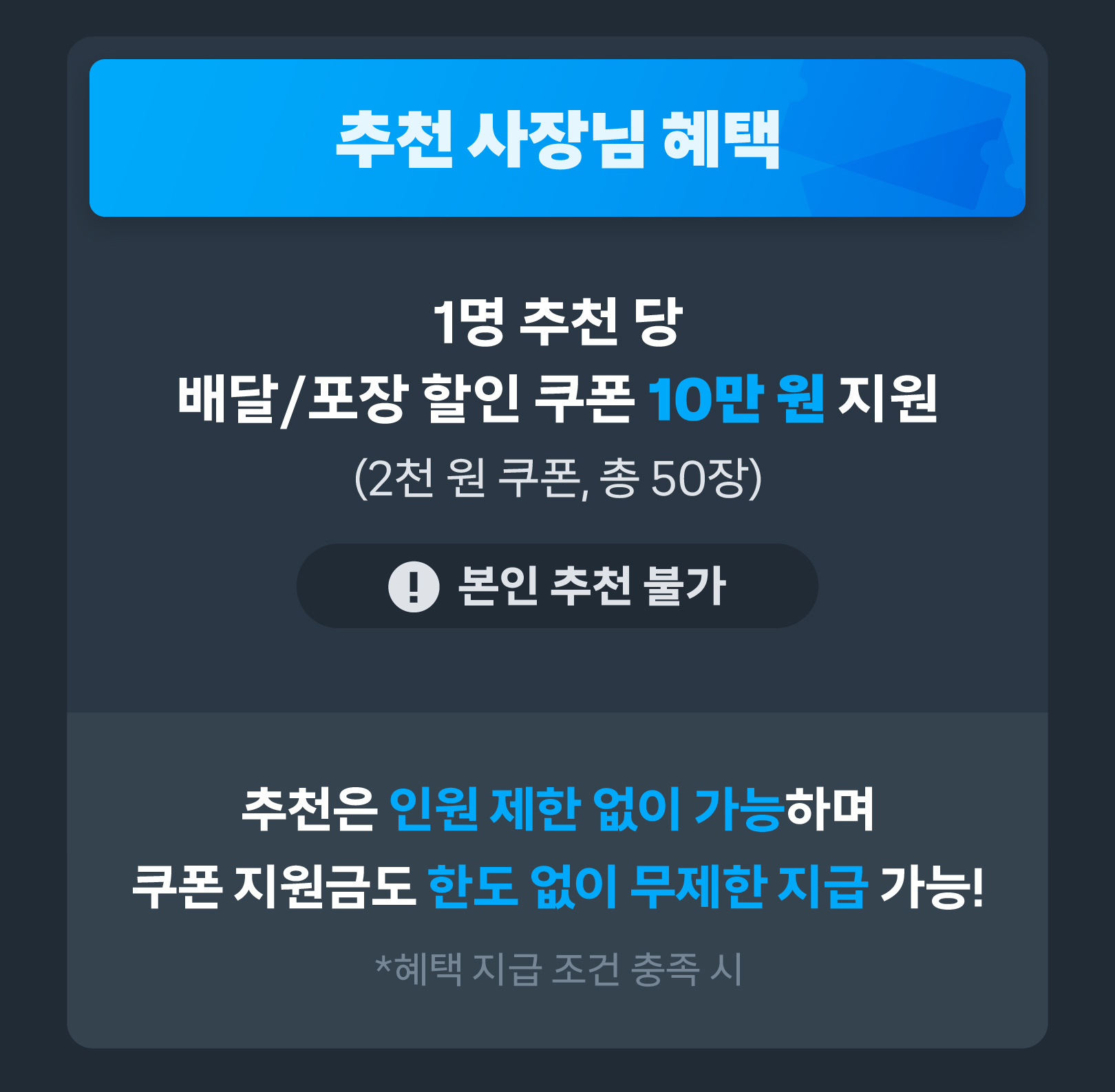 - 추천하는 사장님과 신규 입점 사장님 모두 쿠팡이츠 입점 상태가 아니거나, 법인 사업자인 경우 이벤트 대상에서 제외됩니다.