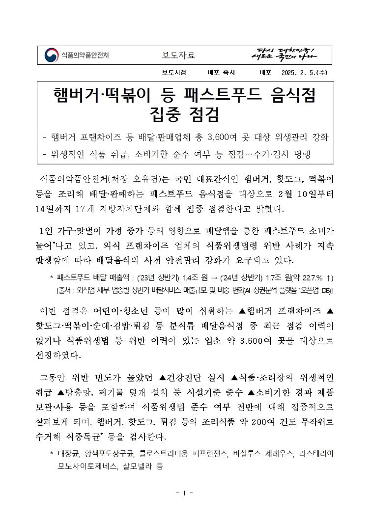 식품의약품안전처는 국민 대표간식인 햄버거, 핫도그, 떡볶이 등을 조리해 배달∙판매하는 패스트푸드 음식점을 대상으로 2월 10일부터 14일까지 17개 지방자치단체와 함께 집중점검한다고 밝혔습니다.