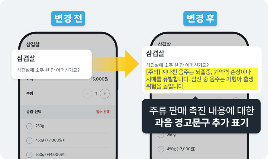 ‘과음 경고 문구’ 기재를 권장 드립니다.