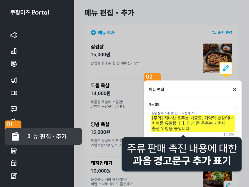 쿠팡이츠 사장님 포털 ▶ 메뉴 편집 ・ 추가