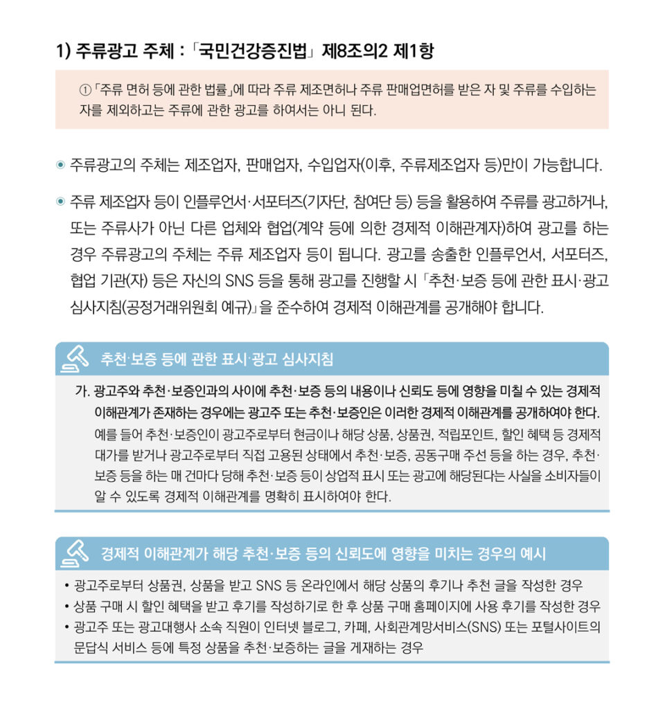 • 17페이지 1번 항목) 주류광고 주체 : 「국민건강증진법」 제8조의2 제1항