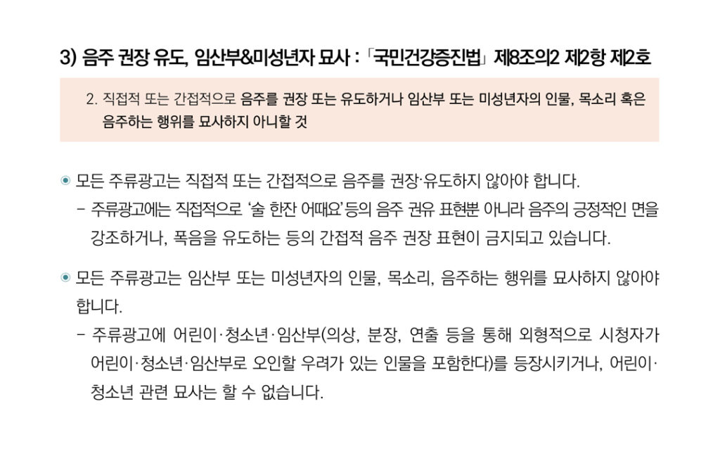 • 19페이지 3번 항목) 음주 권장 유도, 임산부&미성년자 묘사 : 「국민건강증진법」 제8조의2 제2항 제2호