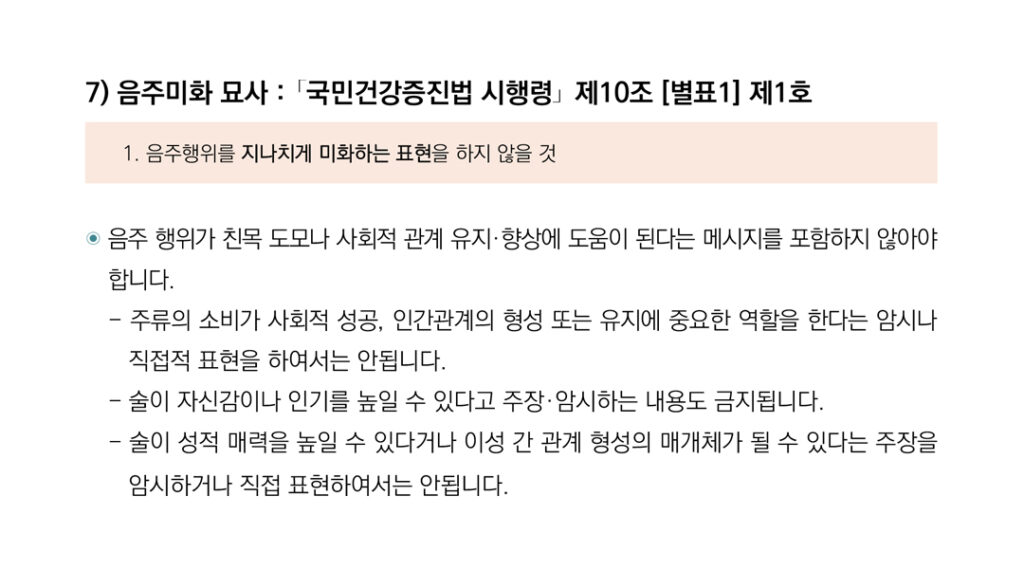 • 21페이지 7번 항목) 음주미화 묘사 : 「국민건강증진법 시행령」 제10조 [별표1] 제1호