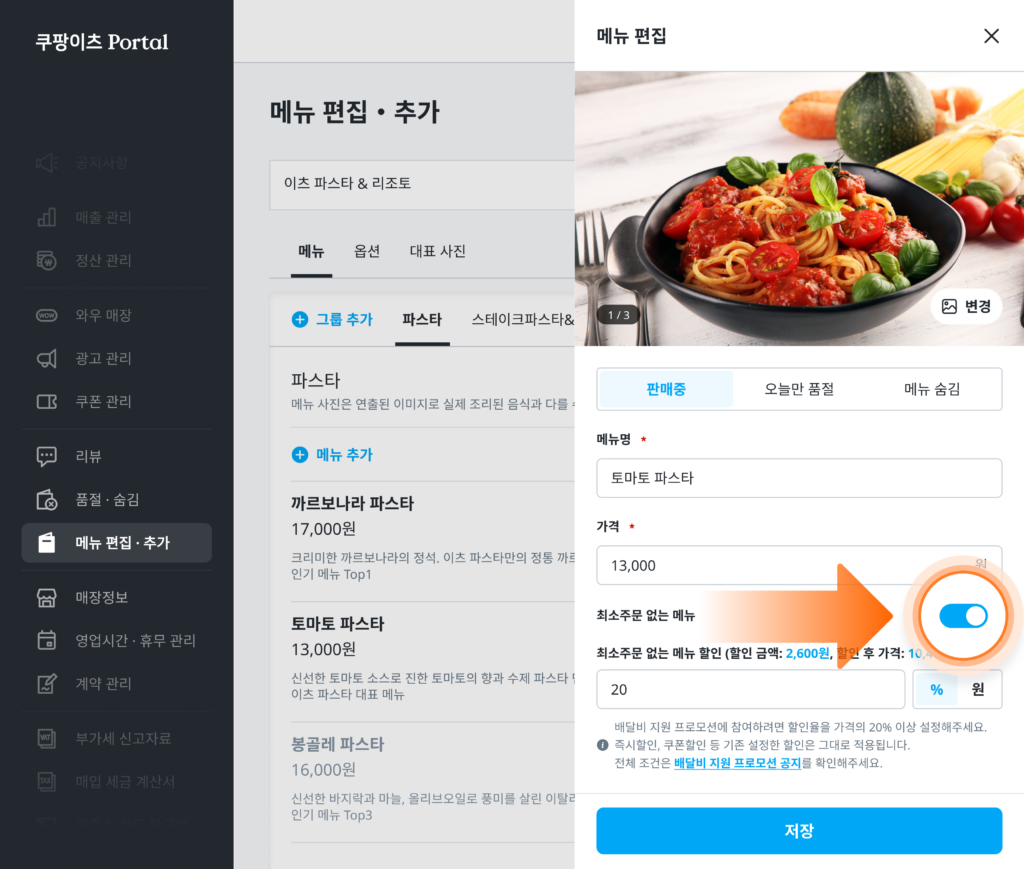 3. 사장님 포털 > 메뉴 편집에서 위 메뉴의 ‘최소주문 없는 메뉴’ 버튼 활성화