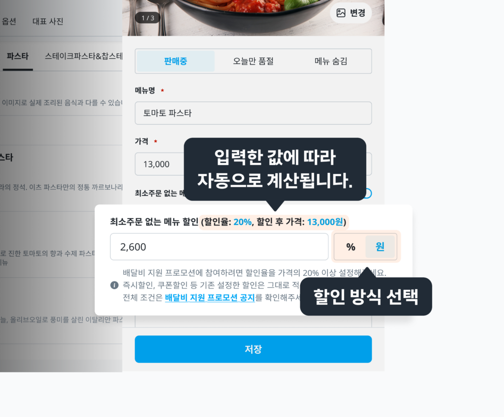 *배달비 지원 프로모션에 참여하려면 할인율을 가격의 20% 이상 설정해 주세요.