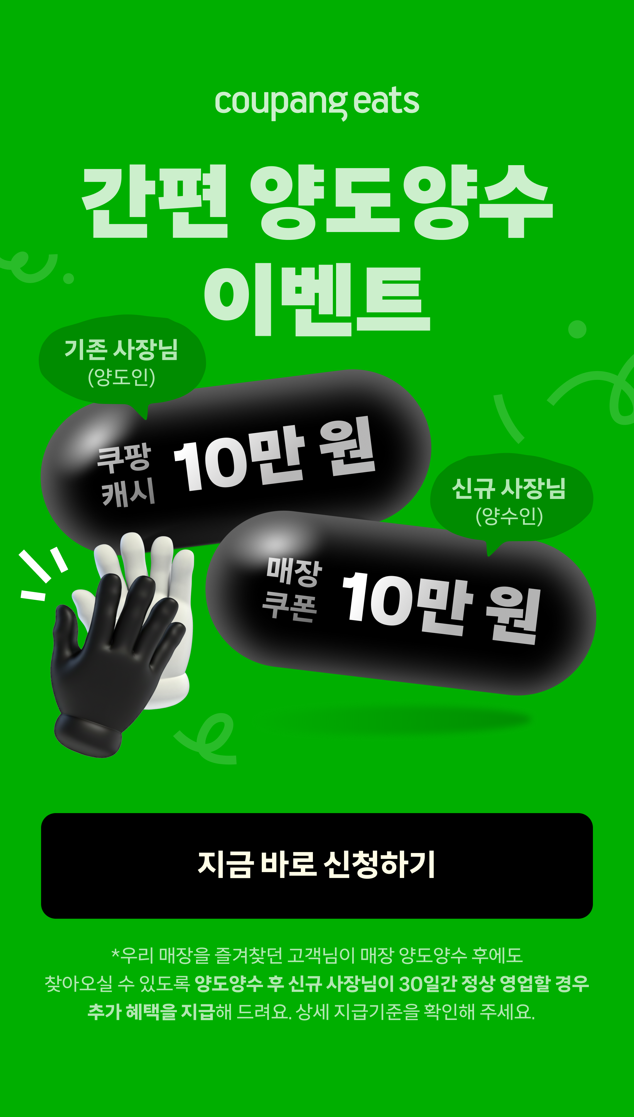 – 기존 사장님(양도인)이 신청 시점에 쿠팡이츠 입점 상태가 아닌 경우 이벤트 대상에서 제외됩니다.