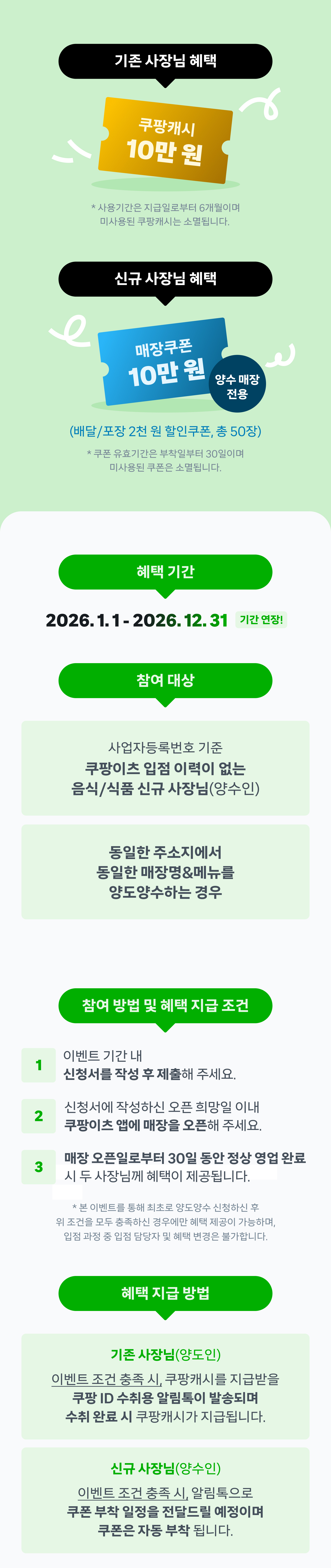 – 기존 사장님(양도인) 혜택으로 지급된 쿠팡캐시의 유효기간은 6개월이며, 미사용된 쿠팡캐시는 자동 소멸되고 부분 환급되지 않습니다.