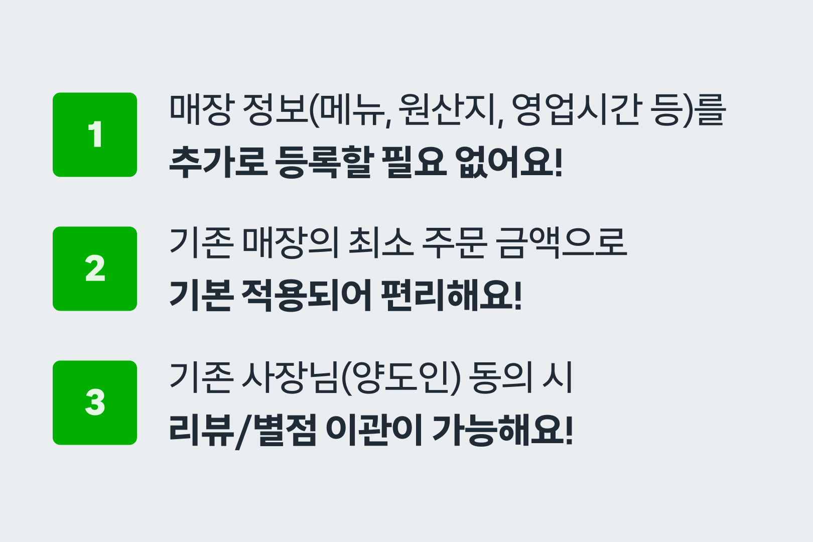 ※ 매장명 & 메뉴 등 매장 동일성이 있고, 회사 내부 기준에 부합하는 경우에 한해 리뷰/별점이 이관될 수 있어요.