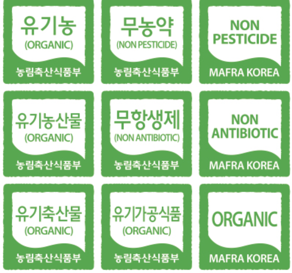 유기농/친환경 농산물유기농 채소/과일, 무농약 농산물  등표시 도형, 인증번호