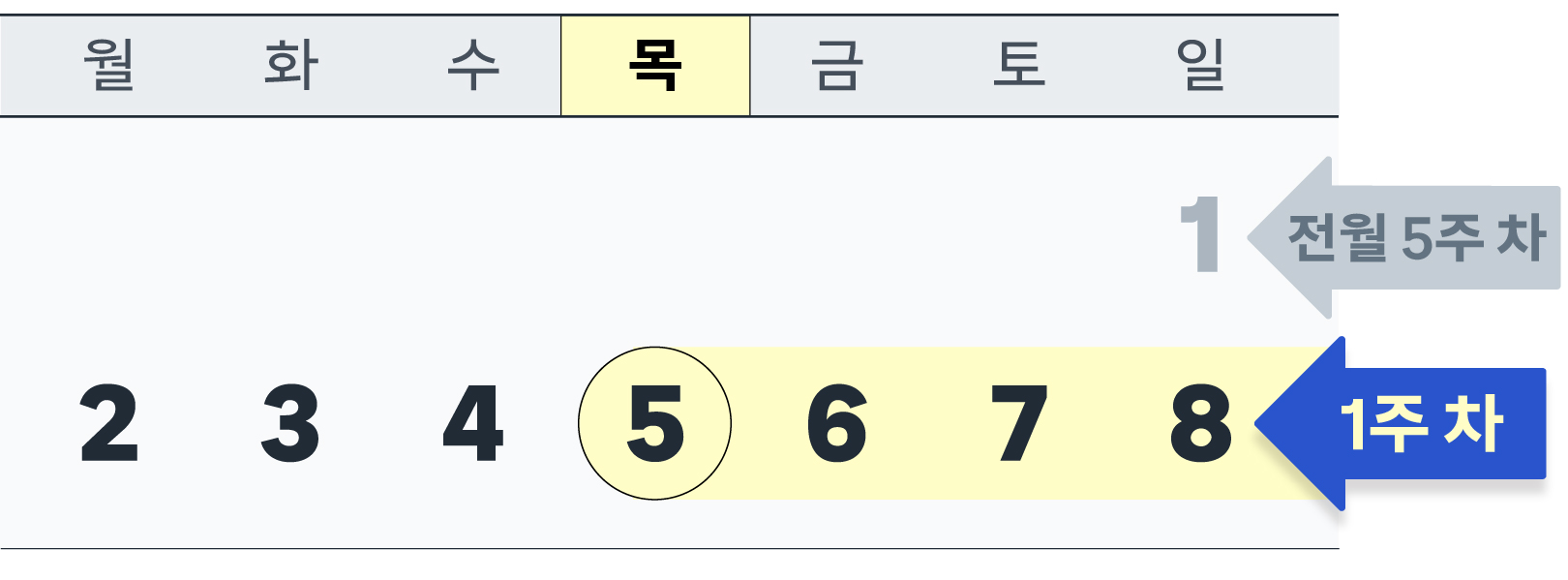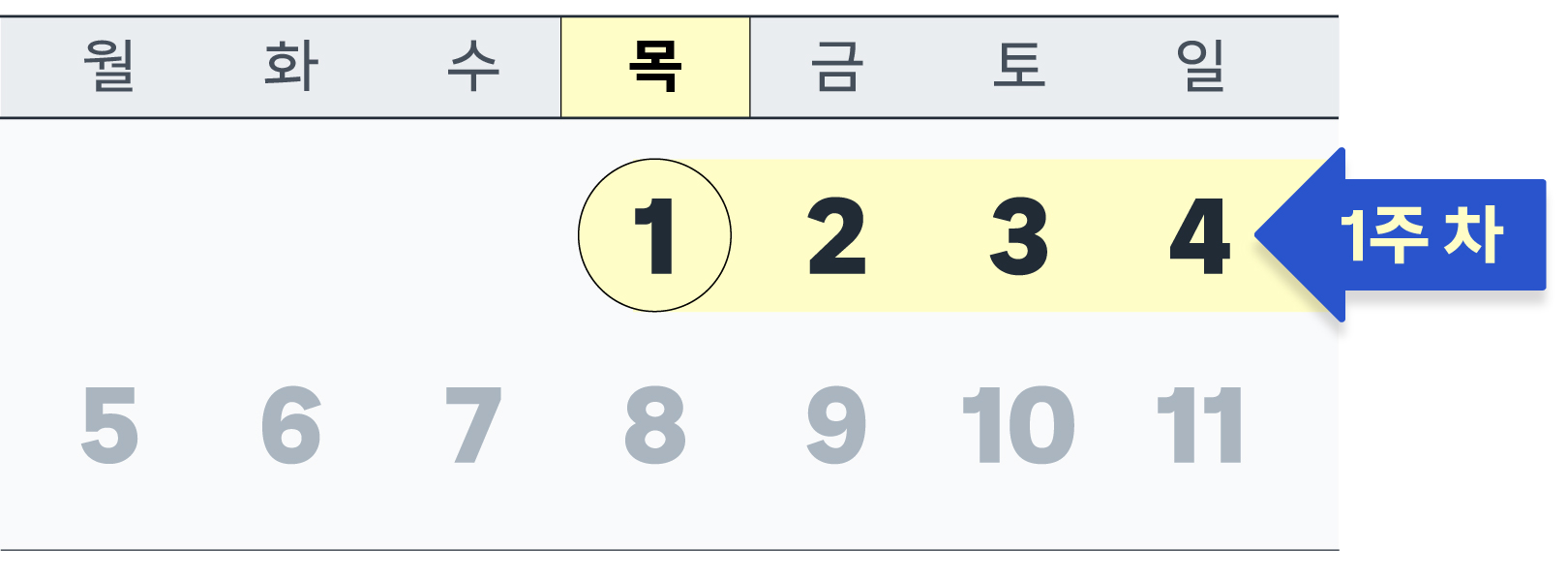 | ✔ 목요일을 기억하세요!매월 첫 번째 목요일이 포함된 주가 1주 차입니다. |